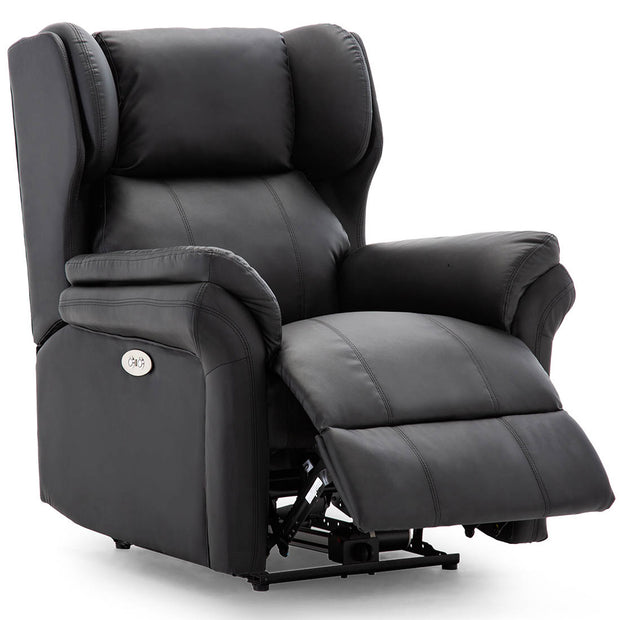 Loxley Rise Recliner Chair Black leather rise recliner chair with padded armrests and a side pocket, set on a grey rug against a white wall.