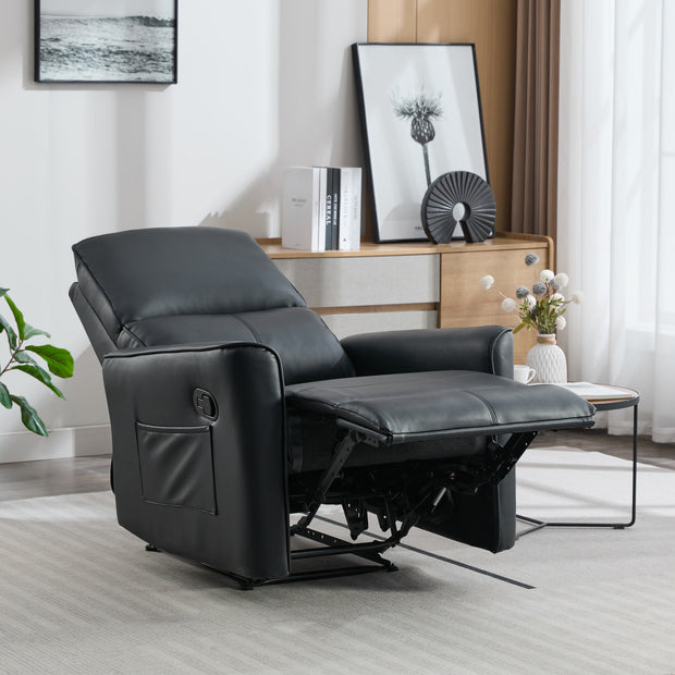 Loxley Rise Recliner Chair Black leather rise recliner chair with padded armrests and a side pocket, set on a grey rug against a white wall.