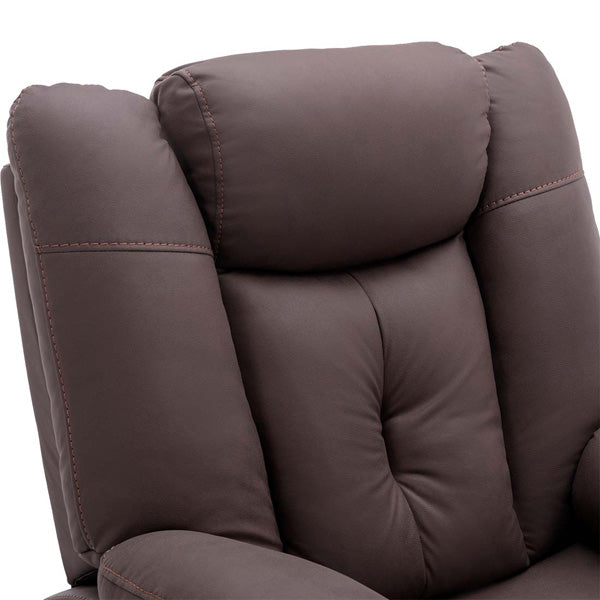 Chester Rise Recliner Chair with Massage and Heat Brown leather rise recliner, featuring padded armrests and a cushioned backrest with vertical stitching details, set in a living room.