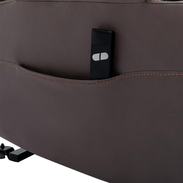 Madison Rise Recliner Chair A dark brown leather rise recliner chair in a living room, featuring padded armrests, a cushioned backrest with subtle vertical stitching, and a side pocket. The chair is elevated in the upright position.