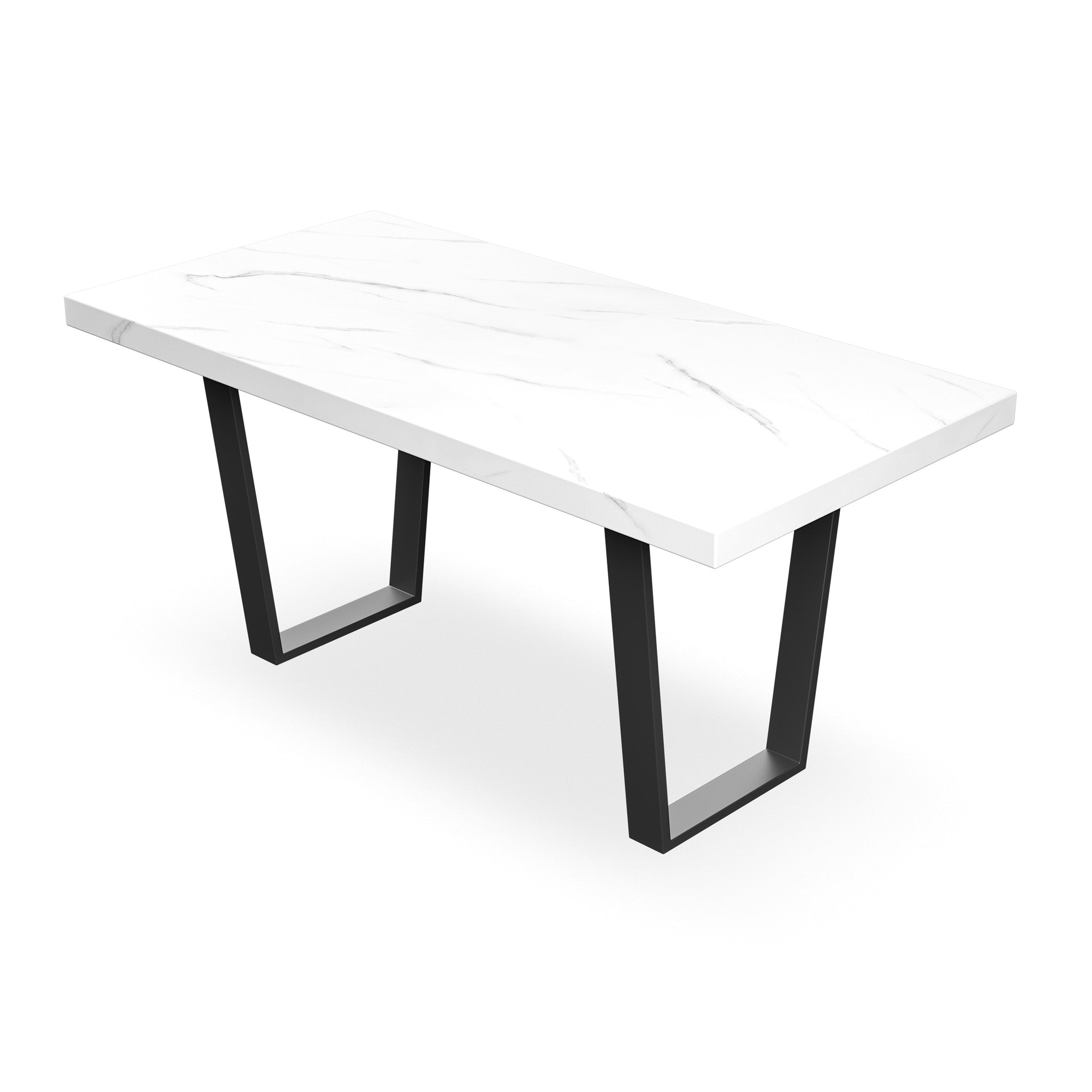 The Aria Dining Table is a beautifully crafted rectangle dining table with a timeless, minimalist design. The table boasts an elegant hardwearing, scratch resistant White Marble effect table top that brings warmth and natural charm to any dining space, perfectly complemented by unique, sturdy, U-shaped solid Black metal legs for a modern contrast. The Aria's simple yet sophisticated design makes it a versatile centrepiece, ideal for both casual meals and formal gatherings. The Aria Dining Table can seat 4-6 people, and yet its compact rectangle shape is perfect for maximizing space while creating an inviting and intimate dining experience. The Aria Dining Table is available in a range of tops (Concrete Effect, White Marble effect, Oak effect, and Black), with 2 types of legs (Stainless Steel Chrome and Black). With the Maya Dining Chair the Aria Dining Table will be the complete set. With gorgeous Boucle material in Ivory white, this sleek, comfy modern Dining Chair compliments the Aria Dining Table brilliantly. Available as a set of 4 or 6 with the Aria Table. Dimensions: Height: 76cm Width: 160cm Depth: 80cm Leg Depth: 57cm Leg Width: 124cm Chair Height: 86cm Chair Width: 45cm Chair Depth: 50cm Seat Height: 44cm Seat Depth: 38.5cm Seat Width: 43.5cm Backrest Height: 40cm