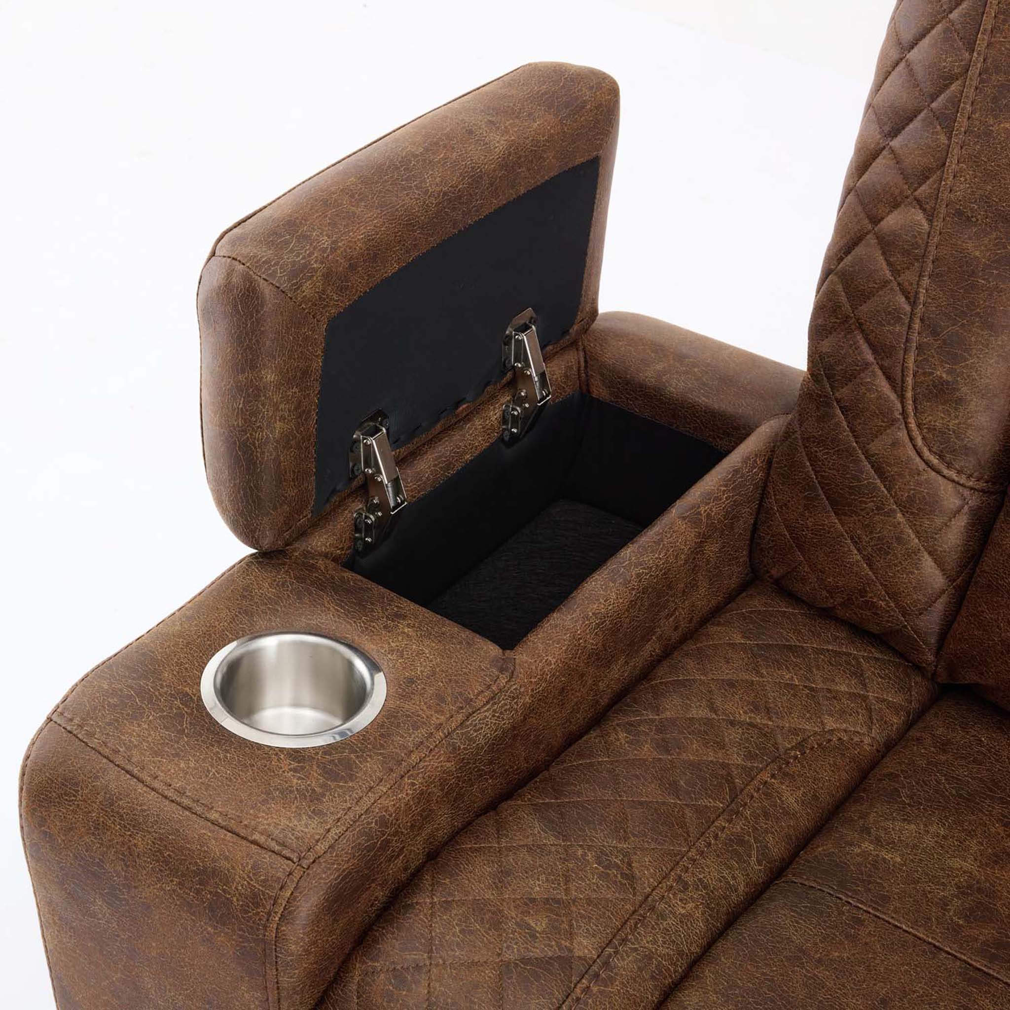 The electric recliner mechanism allows you to find your perfect position at the touch of a button, offering unparalleled comfort. Stay connected with the built-in USB charging port, ensuring your devices are always powered while you relax. The hidden arm storage adds a sleek and practical touch, providing a discreet space for your essentials, like remotes or books. And to top it off, make use of the Ashton’s cupholders on movie night!