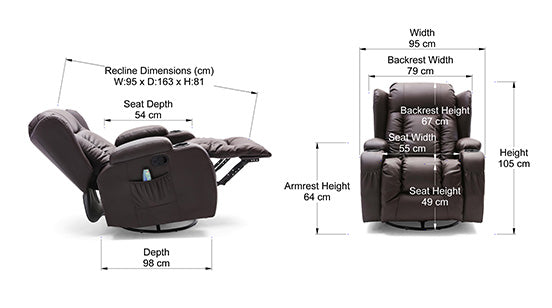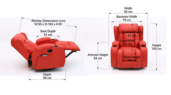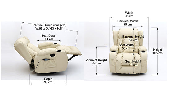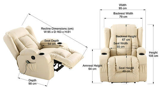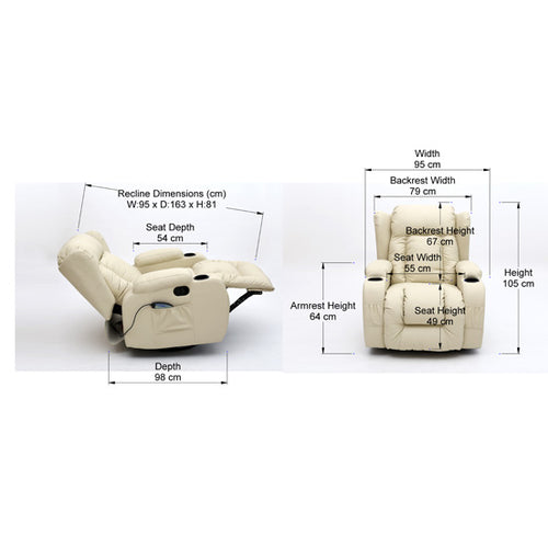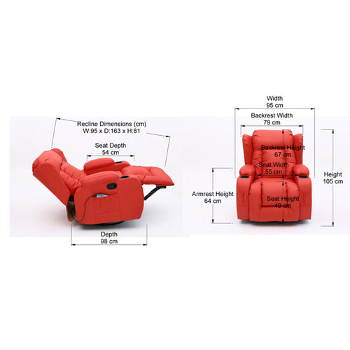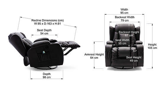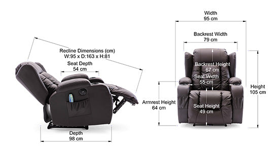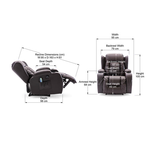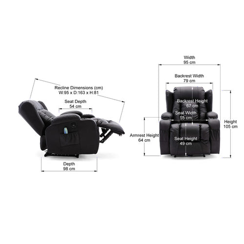 With the simple push of a button, you can indulge in a luxurious, soothing heat and massage. The Caesar Electric Recliner Chair offers comfort style and functionality. With soft padding and full lumbar support, this is the perfect cinema chair. The electric Caesar Recliner is upholstered in super-soft bonded leather and would suit most living areas and studies. Delight in an 8-point vibrational massage to soothe away stress and any aching muscles. Enjoy the gently warming, heated backrest on a cold winter's day. Simple to operate, relax and recline to watch your favourite film, sports game, or play a computer game. Keep your essentials close to hand with useful drinks holders and storage pockets (side and front).