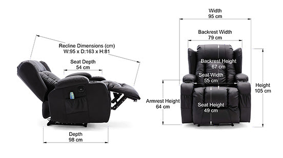 With the simple push of a button, you can indulge in a luxurious, soothing heat and massage. The Caesar Electric Recliner Chair offers comfort style and functionality. With soft padding and full lumbar support, this is the perfect cinema chair. The electric Caesar Recliner is upholstered in gorgeous Technology Fabric, a fabric with a leather like feel, and would suit most living areas and studies. Delight in an 8-point vibrational massage to soothe away stress and any aching muscles. Enjoy the gently warming, heated backrest on a cold winter's day. Simple to operate, relax and recline to watch your favourite film or sports game from the comfort of this chair. Keep your essentials close to hand with useful drinks holders and storage pockets (side and front).