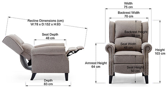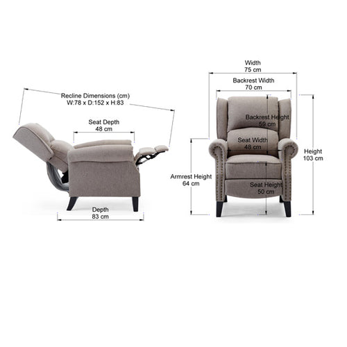 The Charlotte Pushback Recliner makes for a trendy addition to any room with its modern styling and clean finish – perfect for a contemporary living room or stylish study. Firmly supported by legs made from a classic dark wood and a striking stud detail, this recliner is sure to be a head turner in any room. Available in two neutral shades to match a range of interior colour schemes.