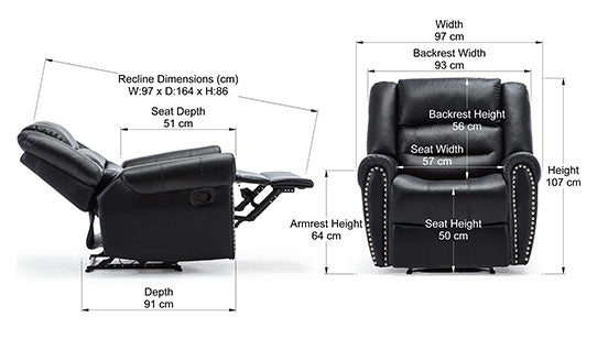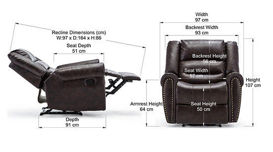 The Denver Recliner Chair with smart studded finishing is the perfect addition to any study or sitting room. Covered in smooth, easy to clean bonded leather, this popular manual recliner is simple to use due to a discreet latch on the side. Designed for comfort, the Denver offers superior lumbar support due to its supportive padded backrest and arms. Whether you're looking to put your feet up after a long day or take a quick nap, this classy chair reclines to an almost sleeping position.