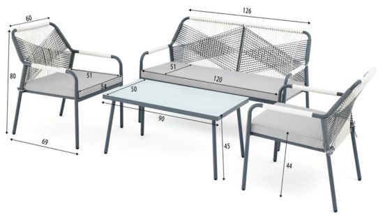 Features - Material: PE Rattan, Steel, Glass and Polyester - Height: 80.5cm, Width: 60-126cm, Depth: 69cm, Backrest Height: 36.5cm, Seat Height: 44cm, Seat Depth: 51cm, Seat Width: 54-120cm, Table Height: 45cm, Table Width: 90cm, Table Length: 50cm