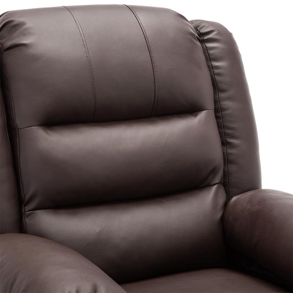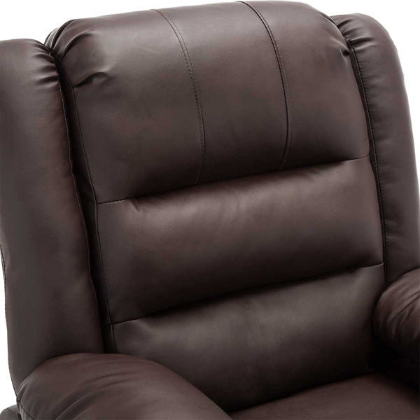 Chester Rise Recliner Chair with Massage and Heat Brown leather rise recliner, featuring padded armrests and a cushioned backrest with vertical stitching details, set in a living room.