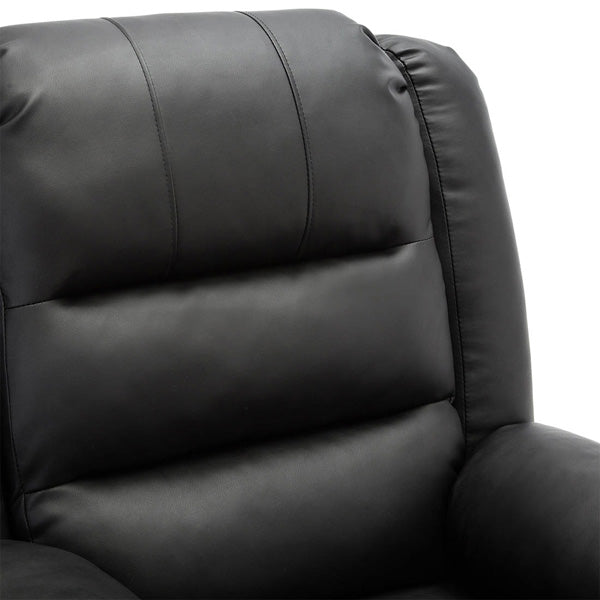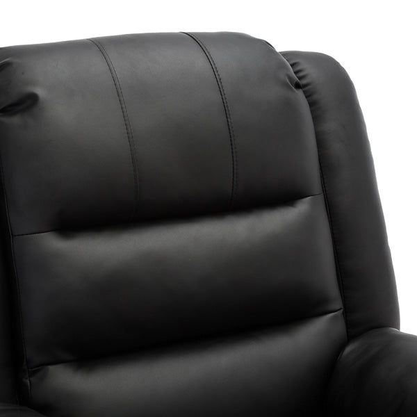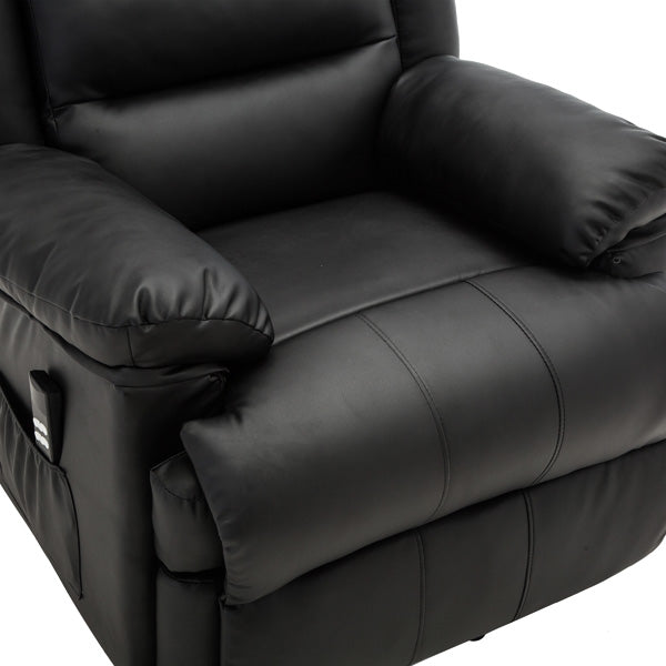 Chester Rise Recliner Chair with Massage and Heat Black leather rise recliner, featuring padded armrests and a cushioned backrest with vertical stitching details, set in a living room.