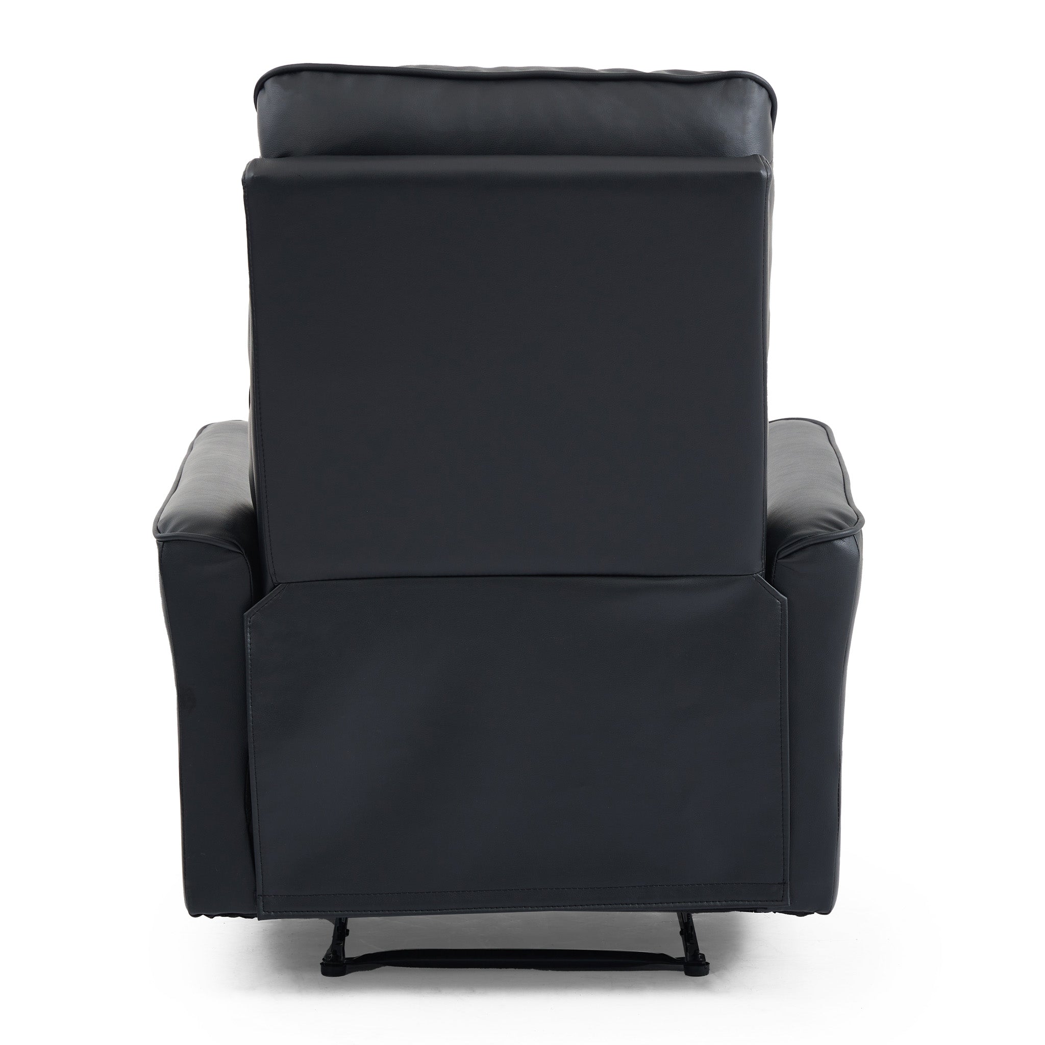 A black, plush recliner chair with padded armrests and backrest on a white background. The chair has a smooth, leather-like finish and a wide seating area.