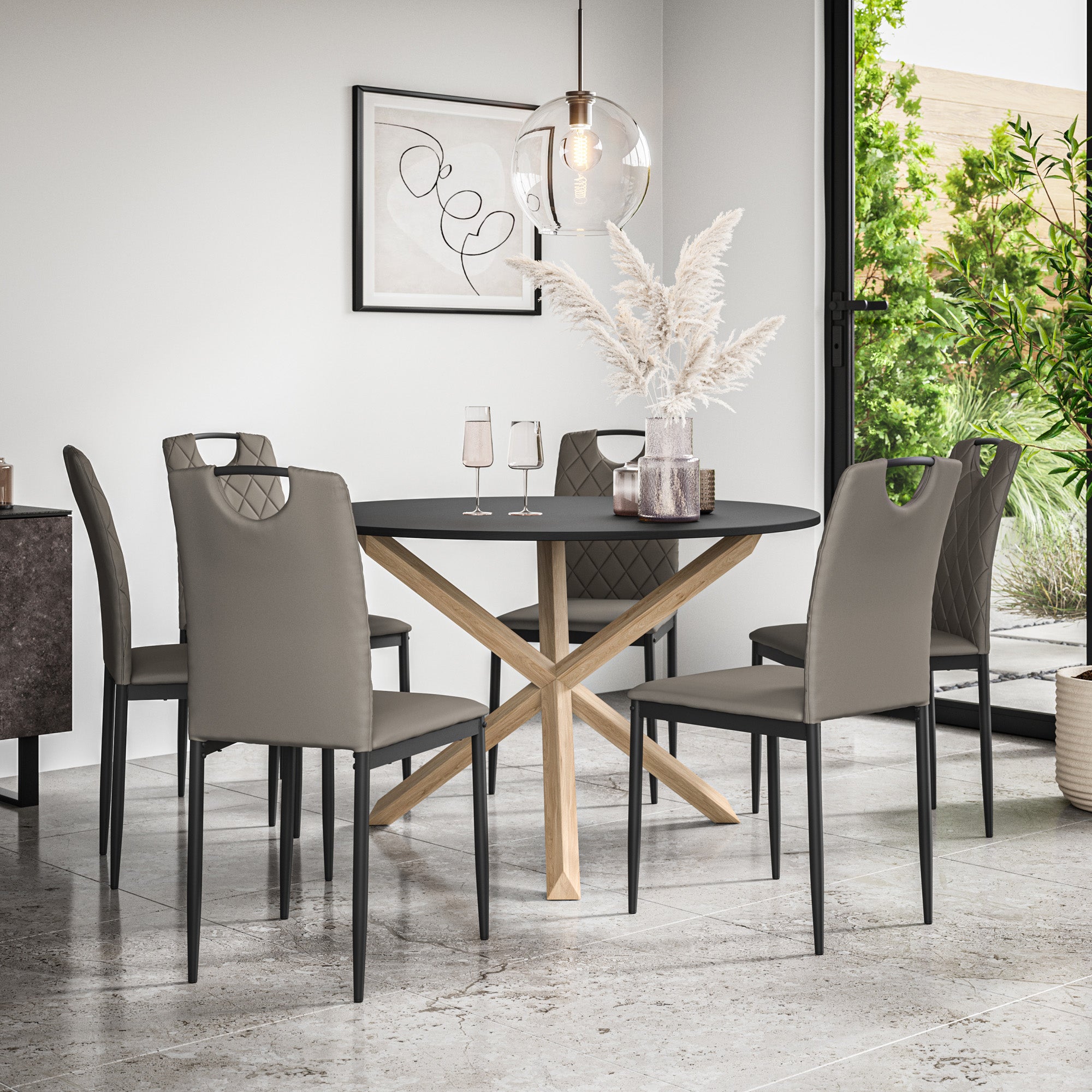 Malvern Round Black Dining Table w Oak Legs & 6 Grey Monza Faux Leather Chairs