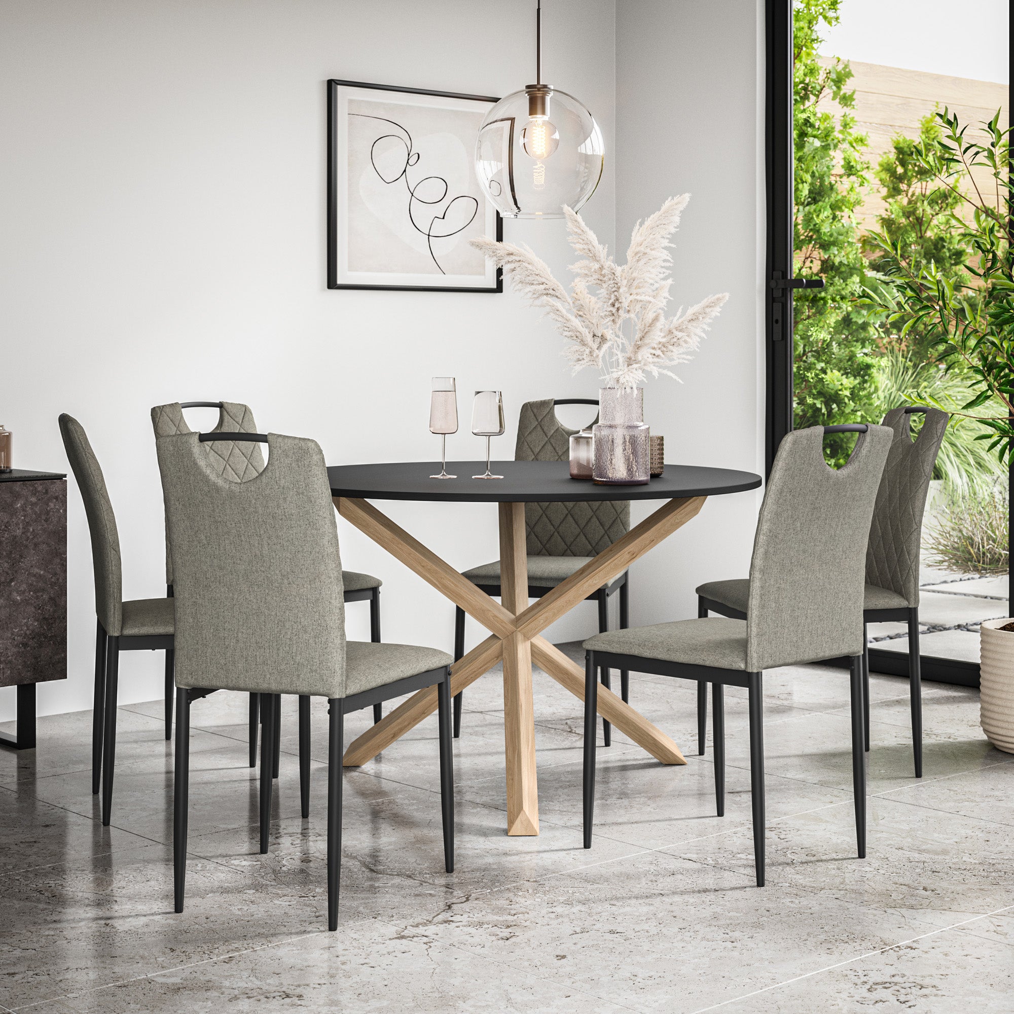 Malvern Round Black Dining Table w Oak Legs & 6 Grey Monza Fabric Chairs