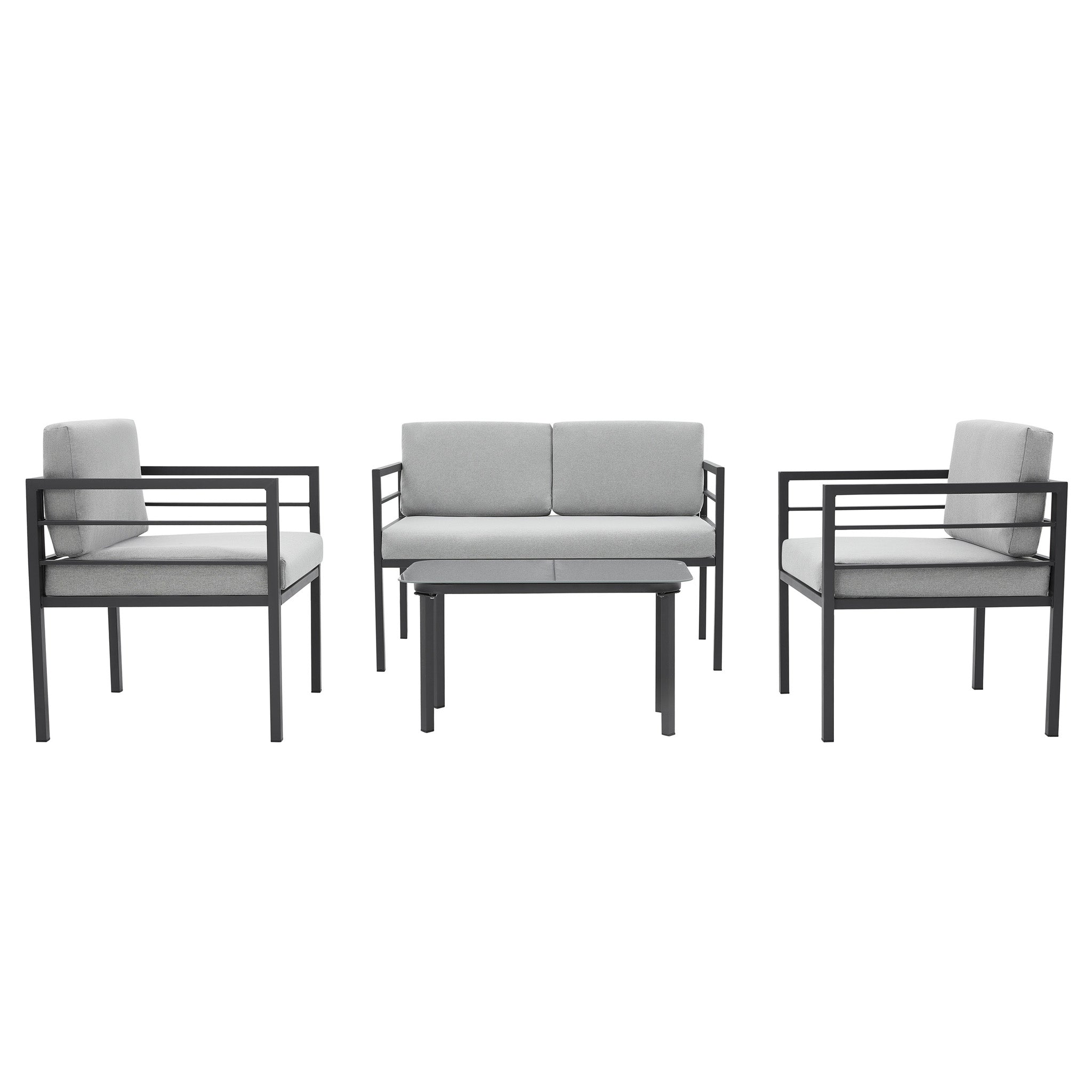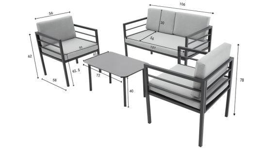 Sit back and embrace the summer in the gorgeous Rhodes Garden Sofa Set. This stunning outdoor furniture set comes with a glass table accompanied by a 2-Seater sofa and two single seater chairs, both of which have gorgeous foam padded polyester cushions. All these great pieces are supported with a super sturdy powder coated steel. The Rhodes is brilliantly simple but supremely stylish, making your garden the social hub of your home. This furniture set is weather resistant and shower proof, with the option of a product specific weather resistant sofa cover to make sure the Rhodes is kept safe all year around. Available in Grey only.