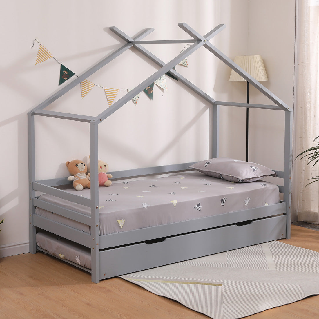 Teddy kids wooden house treehouse single bed frame with guest trundle in grey