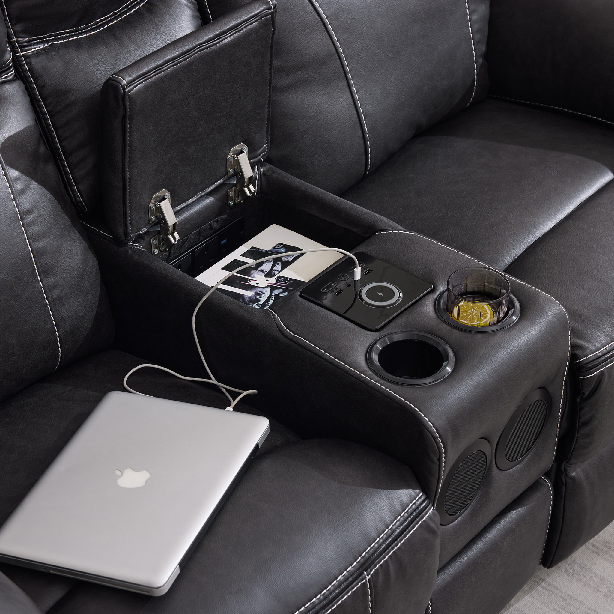 The 3-Seater boasts a fold-down centre console, transforming into a multifunctional tray with wireless charging, cupholders, a plug socket section equipped with USB and USB-C ports, ensuring all your devices stay powered. An integrated touch light hidden in the middle headrest provides added convenience, perfect for evening relaxation, a late-night movie marathon, or night-time reading. The Vinson also boasts a hidden storage drawer at the base of the middle seat.
